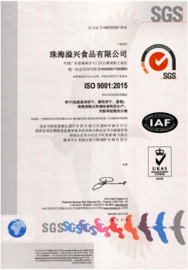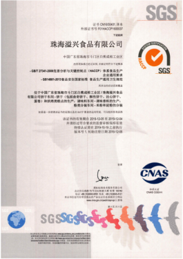 此外,溢兴于2005年荣获国际著名质量认证机构SGS颁发的「ISO9001质量管理系统」及「HACCP国际食品安全管理体系专业认证」,由此证明不论生产规模、流程控制、效益管理、乃至卫生安全、各种食品危害分析、评估、控制及在食品制造过程中对质量监控的能力均达至国际水平,产质量素出众超群。