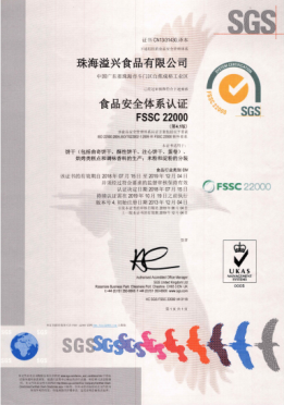 溢兴获取国际著名质量认证机构SGS申请颁发的「FSSC22000食物安全体系认证」。
